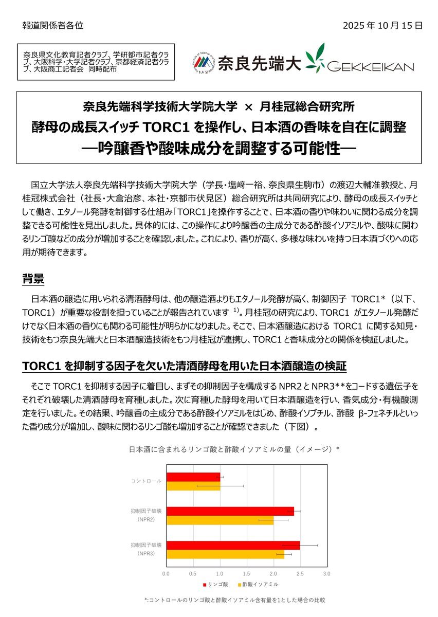 【プレスリリース】 奈良先端科学技術大学院大学 × 月桂冠総合研究所 酵母の成長スイッチTORC1を操作し、日本酒の香味を自在に調整 ―吟醸香や酸味成分を調整する可能性― naist.jp/pressrelease/2… #奈良先端大 #NAIST #月桂冠 #酵母 pic.x.com/fKlgzfzYVS