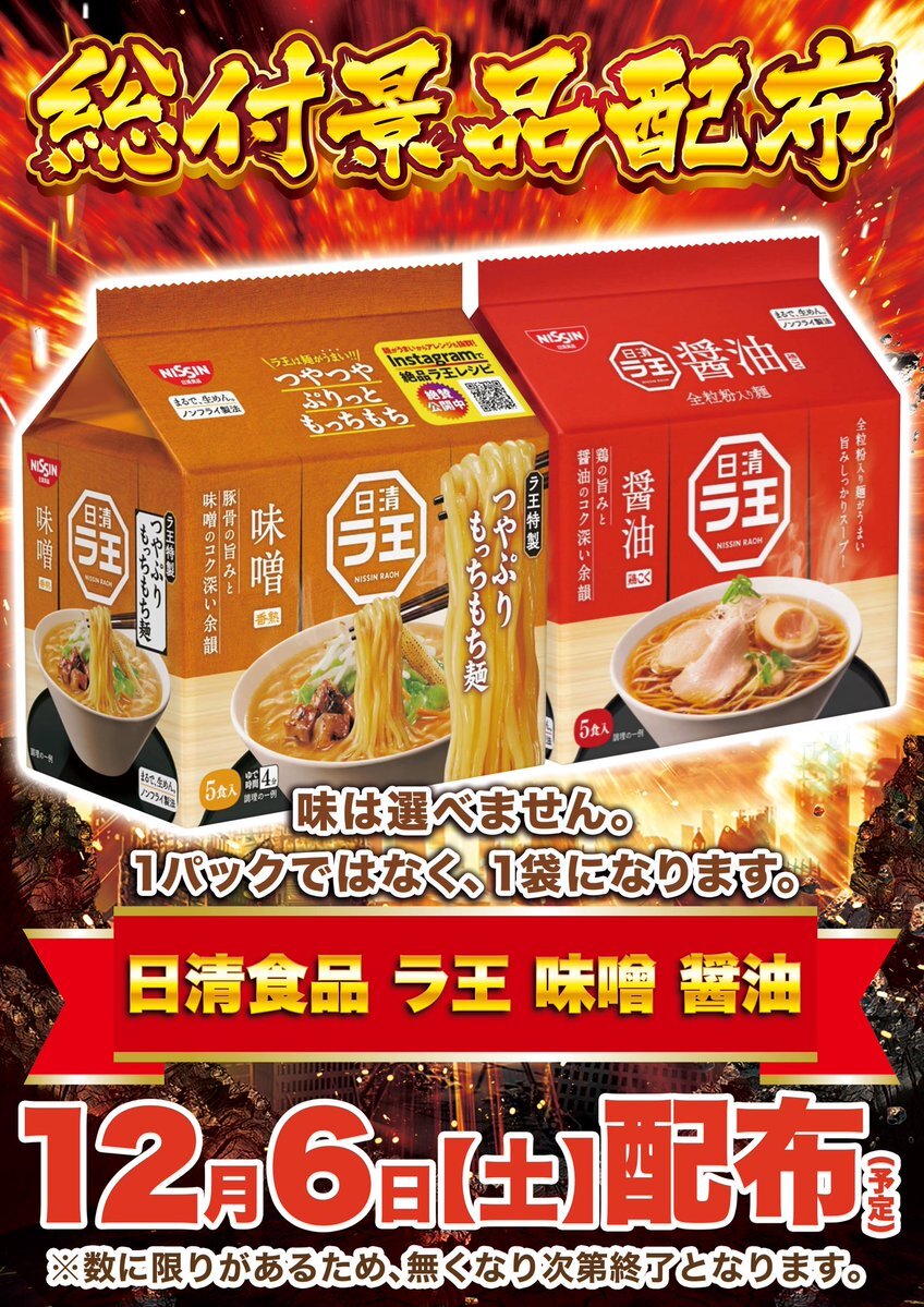 この後、 ご遊技中のお客様へ ꕤ︎︎#感謝 ꕤ︎︎の気持ちを込め 🌸総付景品配布(予定)🌸 本日は➡️ 🍜#日清 #ラ王 (袋麺)🍜 #味噌 or #醤油 この後のお時間も 👑キングオブDステーション👑 お楽しみください(๑•̀ㅂ•́)و✧ #近日 #接近中 #何かが起こる #ラオウ #ラーメン pic.x.com/OFDAR1pV2a x.com/dstation_kanek…
