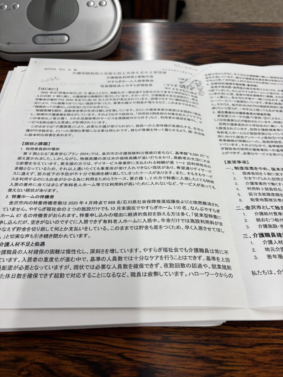 金沢市との介護保険制度についての懇談に参加。現場の実態は、ほんとうに厳しい。保険料利用料負担も、人材確保も、働く環境も、施設維持も。 支える側が支えられるのが介護現場のすばらしさ、でも施設閉鎖となる、と施設長より。苦しい選択。 この声、市長は聞かないといけないのでは?#金沢市 pic.x.com/8CGKTeCJhv