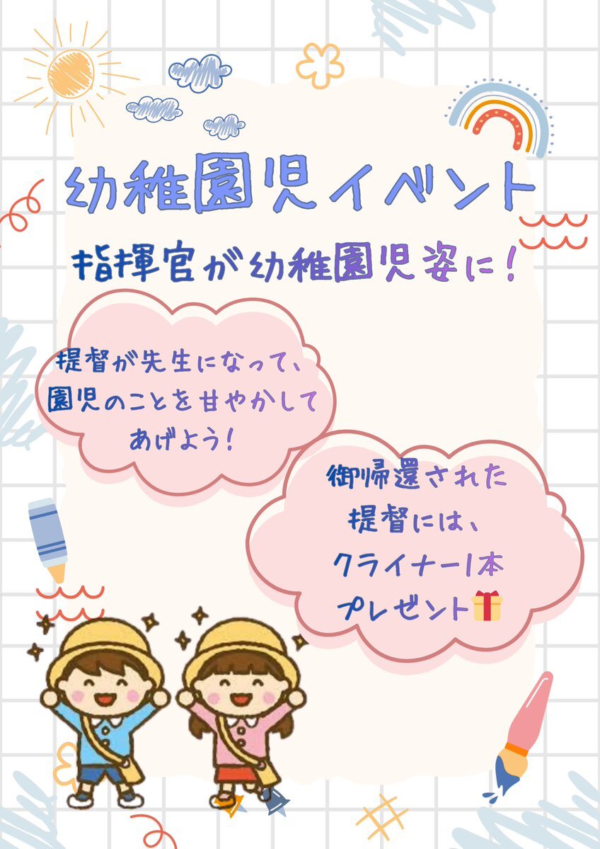 今週末は幼稚園児イベント行います!! 可愛い幼稚園児になった、指揮官を見に来てください🥰 ご帰還された方には、クライナープレゼントさせていただきます🎁 是非とも、足をお運び頂けたら幸いです😆 #釧路 #コンカフェ x.com/lilac_07_01/st…