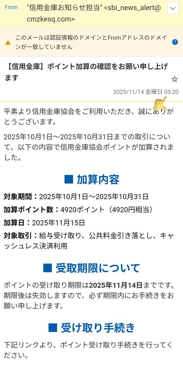 信用金庫から、ポイントあるから受け取ってね♪メールがきて、へぇーって思って見てたら凄い時間に来てるし、注意⚠️マーク出てるし明らかに詐欺メール😂 てかいつの間にポイントなんて出来たんだよww #詐欺メール #銀行 pic.x.com/IegY0e77l2