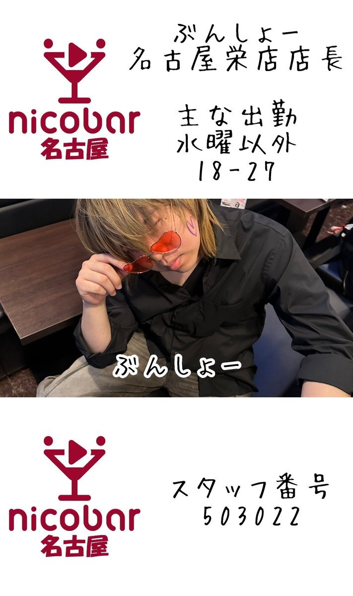🌃10.9(木)深夜スタッフ 18時〜翌朝5時まで営業中! 21-29 ぶんしょー @bunbunsho_kun 22-26 ちゃんた @r_ox0 24-29 しの @shino_nicobar 今月のカレンダークーポン 700円以内の料理一品無料🍴 #名古屋 #栄 #錦 #錦三 #飲み放題 #一人飲み #喫煙可 #栄コンカフェ #錦コンカフェ #Mixコンカフェ pic.x.com/d2hiKApoSl x.com/nagoya_nicobar…