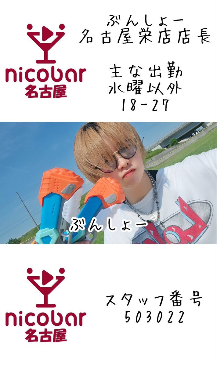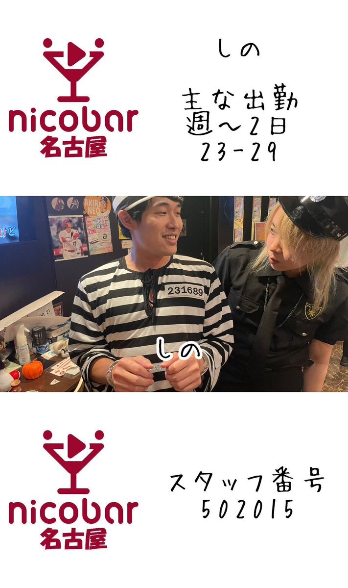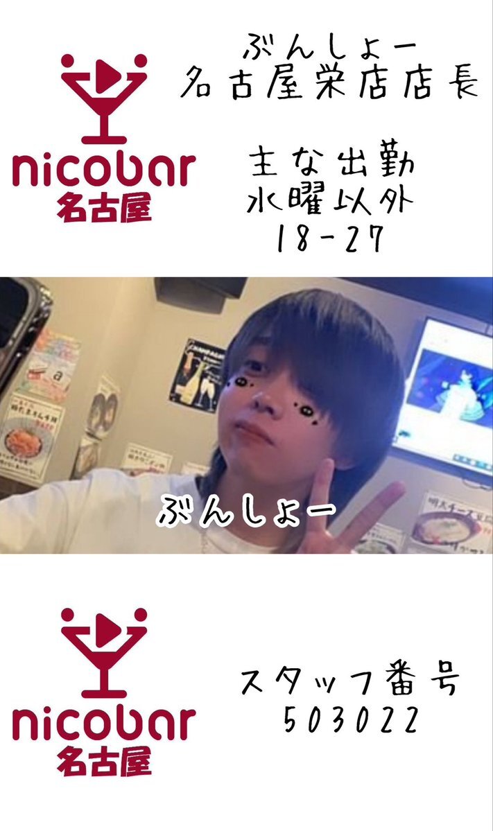 🌃10.17(金)深夜スタッフ🌃 18時〜翌朝5時まで営業中! 23-29 ぶんしょー@bunbunsho_kun 24-29 しの @shino_nicobar 今月のカレンダークーポン📣 700円以内の料理一品無料🍴 #名古屋 #栄 #錦 #錦三 #飲み放題 #一人飲み #喫煙可 #栄コンカフェ #錦コンカフェ #Mixコンカフェ #ダイニングバー pic.x.com/gfmWZ6fr6w x.com/nagoya_nicobar…