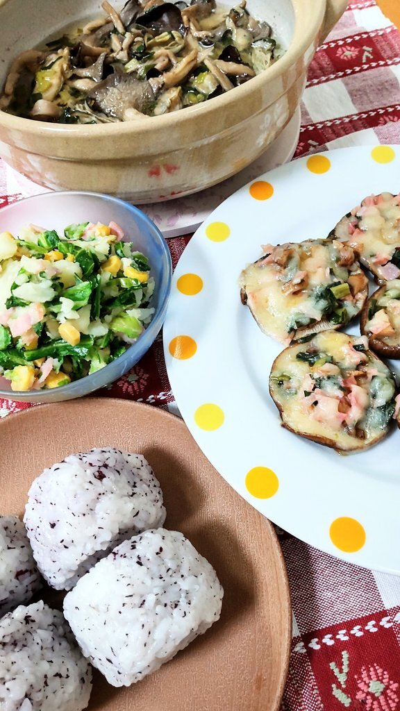 今日も1日お疲れ様です😌🍵🍡 🍀今夜のお献立🍀 🌟牡蛎とキノコのアヒージョ 🌟キャベツのポテトサラダ 🌟椎茸のベーコンチーズ焼き 🌟ゆかりおにぎり 夜も冷え込みますので、暖かくしてお過ごし下さい🌠 #OnigiriAction #鍋 #おうちごはん pic.x.com/DaDK3fSVLb