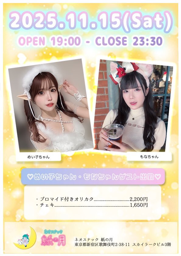 【🌙🐈ゲスト出勤のおしらせ🌙🐈】 11月15日(土)19:00~23:00 「めい子ちゃん・もなちゃんゲスト出勤」 🐈出勤キャスト🐈 ゲスト:めい子🤍19-23:30 ゲスト:もな💛19-23:30 --------- えるママ🩵(@6KNDL6 ) ゆらの🎀(@yurano_mtzk ) ひめき👾(@himeki_kisaragi ) 東雲🌼(@shino_nomeeeee_ )