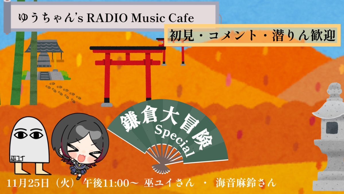 11月25日㈫午後11時~ ⛩🎋 ゆうちゃん's RADIO Music Cafe ゲスト:巫ユイさん・海音麻鈴さん @yuikaminagi @Umine_musica ⭐鎌倉大冒険スペシャル⭐ 二人と一緒に素敵な大冒険を!!! 配信場所⇩ twitcasting.tv/kaigiyuu #配信者好きさんと繋がりたい #鎌倉市 キャス画協力:海音麻鈴さん pic.x.com/kVm7jOpC2v