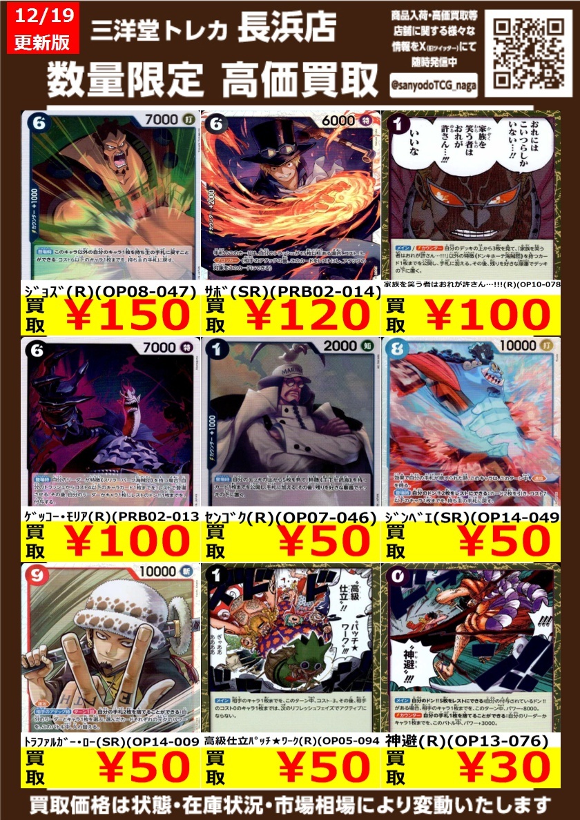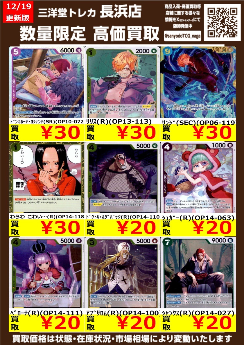 #ワンピカード その② 💡高価買取情報更新💡 ドシドシお持ち込みください‼ ✅ドンキホーテ・ドフラミンゴ(SR)(OP14-069) ¥200 ✅浸食輪廻(R)(OP14-096) ¥150 ✅シルバーズ・レイリー(R)(OP14-108) ¥30 #三洋堂トレカ館 #長浜 pic.x.com/HNPYO2xmQb