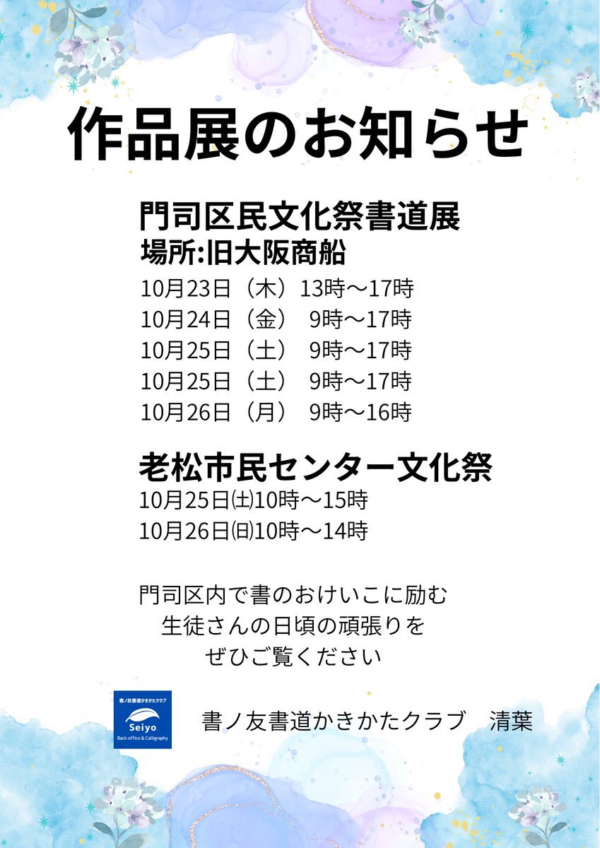 【作品展のお知らせ】 門司区内で書を習う生徒さんたちの作品や講師たちのが集まります。 芸術の秋にふさわしい素敵な作品がたくさんあり、とても見応えあります。 ぜひ足をお運びください✨ #門司区民文化祭 #書道展 #北九州市 #門司港 #書ノ友書道かきかたクラブ #旧大阪商船 #老松市民センター pic.x.com/SewY1QBcmy