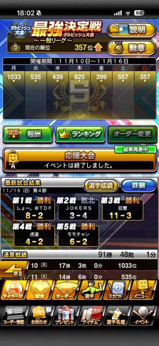 最強決定戦 357位でフィニッシュ! OB取ってないけど、純正最決はMVPリベンジしたいな #ダルビッシュ最強決定戦 #阪神純正 #プロスピA #KONAMI pic.x.com/Uou1L1Fxbl