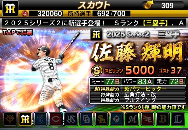 まさかのサトテルBランクからパワー+1のパワー83!! とりあえずスカウト10連だけ引いたら自チーム演出からのテル降臨✨✨ 24シリ1からやっと継承出来る☺️ 特能が変わらなかったのも嬉しい🤩 #プロスピA #阪神純正 pic.x.com/78UPAaFcjr