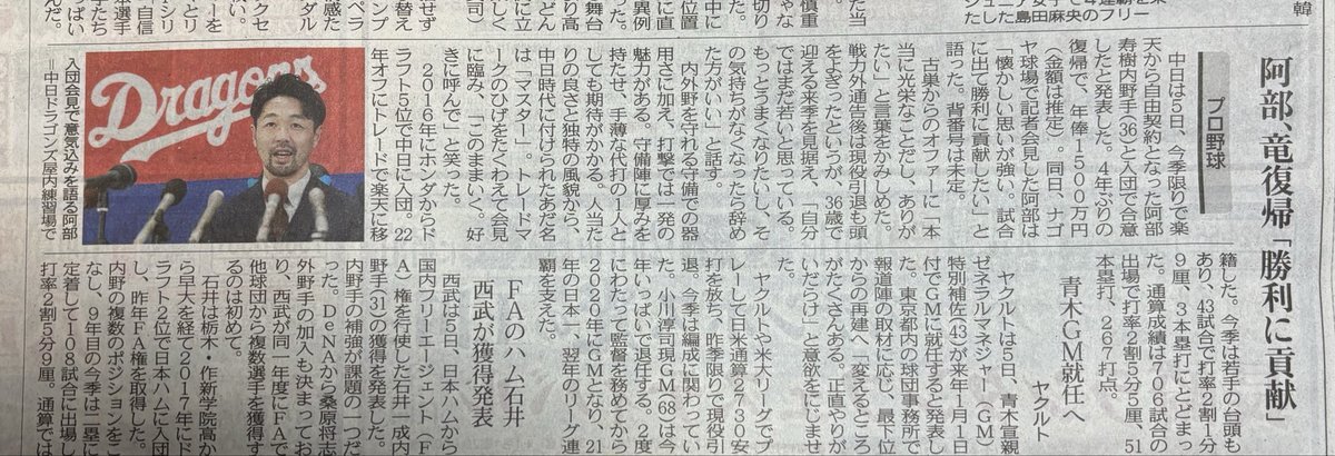 ドラフト以外での新加入は,阿部1人 来季は若手の成長に託す…と言う事でしょうか? 開幕迄にワクワクするような補強を期待します #阿部寿樹 #中日ドラゴンズ 【中日】阿部寿樹「あらためてここに来て…懐かしい思いとありがたいという思いが強い」中日スポーツchunichi.co.jp/article/1174526