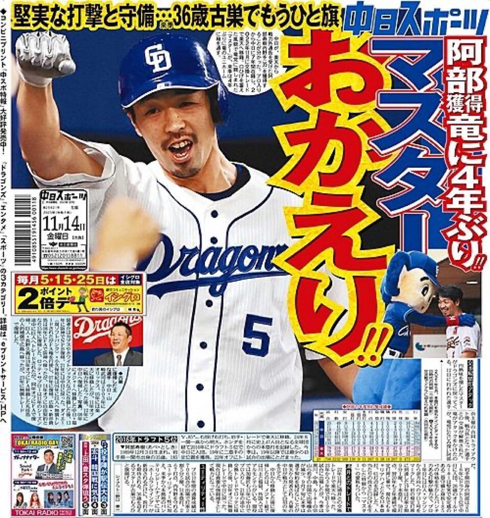 中日スポーツ一面出てるからマスターの復帰はほぼ決定でしょう #阿部寿樹 #マスター #中日ドラゴンズ #中日スポーツ きょうの紙面:中日スポーツ・東京中日スポーツ chunichi.co.jp/article/1163862