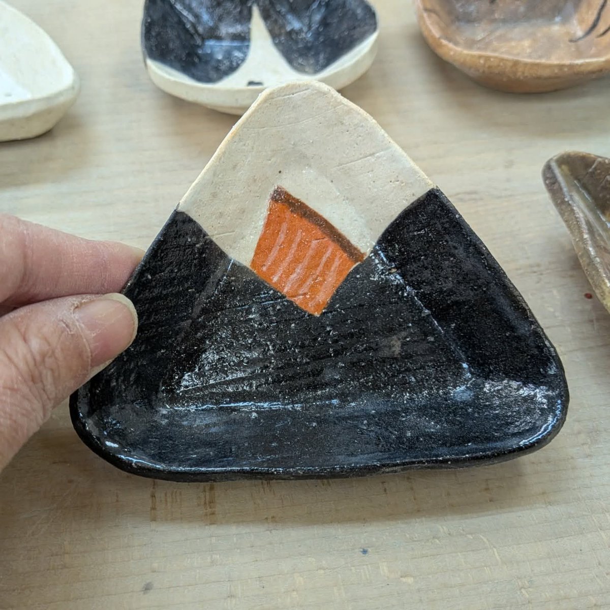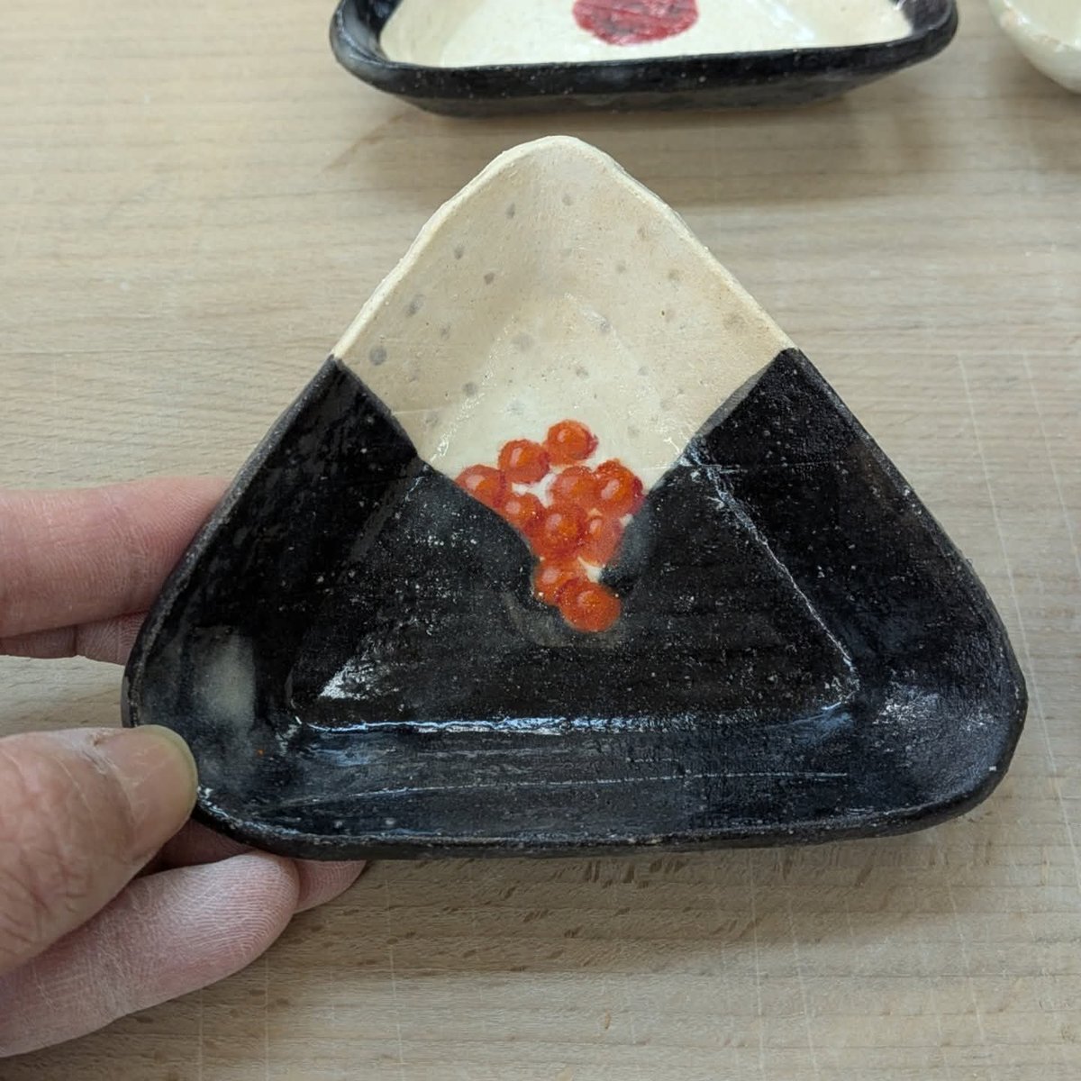 小鉢たちが焼き上がった!思ってたよりいい方向に色が出てた🫶イクラが1番お気に入り。鮭も中々。枝豆とひじきのおにぎりが「炊き込まないで炊いた後に混ぜれば良かったー」みたいな色になった😂 そして、やっとでアレの蓋を作り始めました。 #ぷーこの手習い #陶芸 pic.x.com/WyovymNnEv
