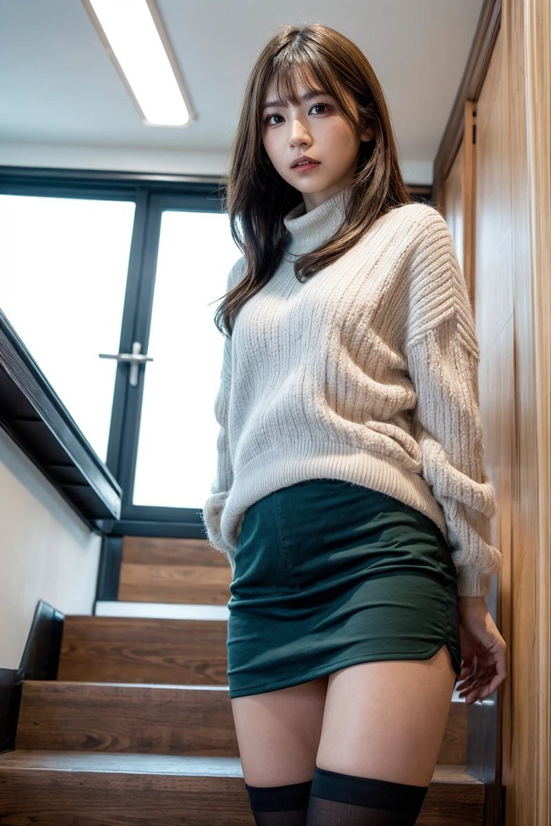 涼しくなってきて、ニットのシーズン🧶 グリーンのミニスカートが今年のトレンドになるといいなぁ🕶️👔 少しミニかもだけど、後ろから覗かないでね・・ #AIart #階段 #ミニスカート pic.x.com/nLZtRw7tTN