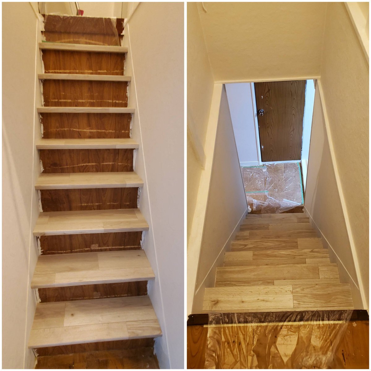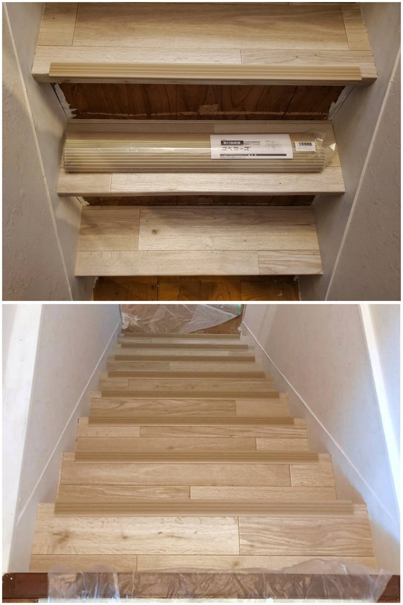 #階段 のつづき💪 #スベラーズ は #ベージュ 色を試したらいい感じになりました✨裏面の両面テープが想像以上に強力やったんで貼るのは一発勝負☝️この緊張感がたまらんね~👍蓄光ラインが暗い時にどの程度光ってくれるのかは後日チェックします💡 #CF は #東リ #CF9607 #DIY pic.x.com/2NILMob1LW x.com/M2103O/status/…
