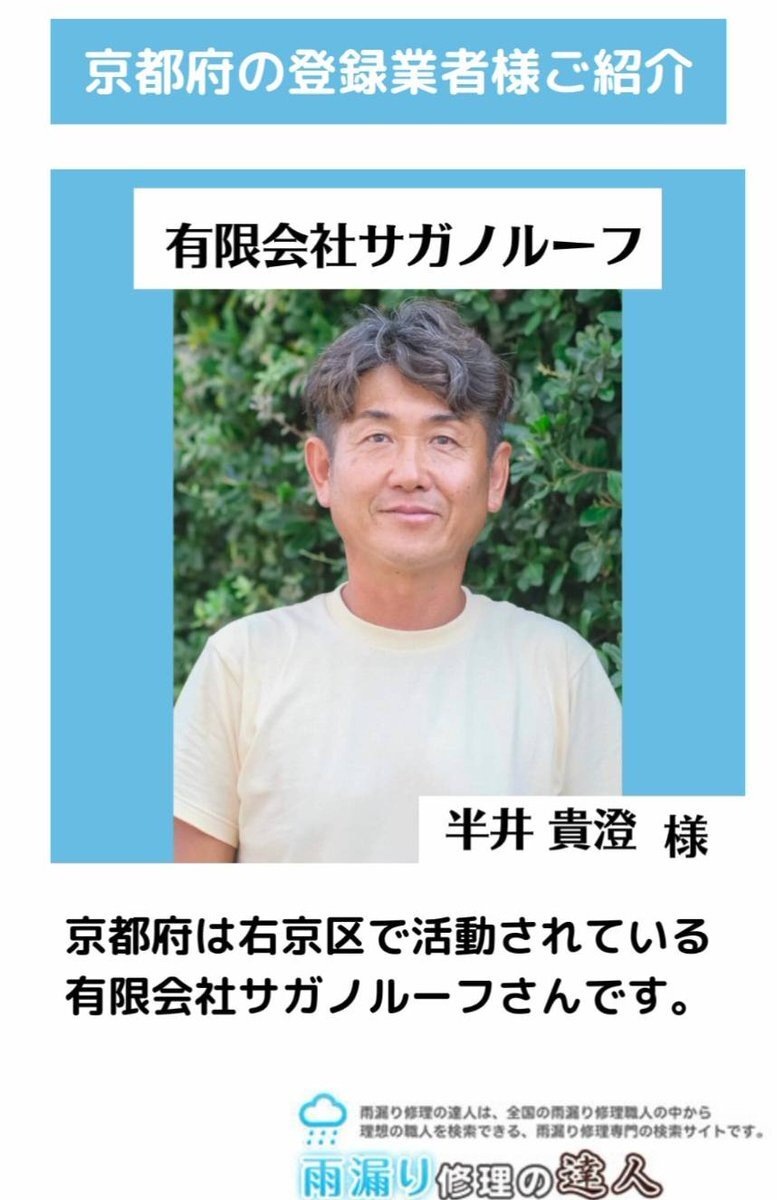 弊社サイトにご登録いただいている京都府の「有限会社サガノルーフ」様です! 雨漏り修理の達人では、掲載ご希望のお問い合わせが毎月多くの会社様から頂いております。 #雨漏り #雨漏り修理 #防水 #防水工事 #ベランダ防水 #板金工事 #塗装工事 #リフォーム pic.x.com/0t9viavXv0