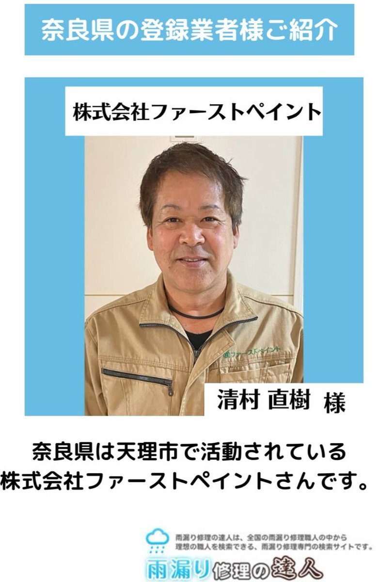 弊社サイトにご登録いただいている奈良県の「株式会社ファーストペイント」様です! 雨漏り修理の達人では、掲載ご希望のお問い合わせが毎月多くの会社様から頂いております。 #雨漏り #雨漏り修理 #防水 #防水工事 #ベランダ防水 #板金工事 #塗装工事 #リフォーム pic.x.com/6pceZjNl4L