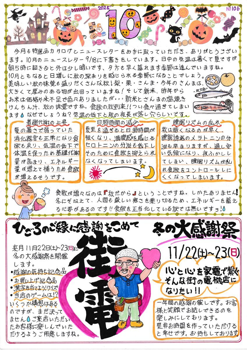 10月のニュースレター 家内の幸枝ちゃん手書きの✍️✍️✍️ 11月22日(土曜日)・23日(日曜日)に開催のいつもの感謝祭💕💕 #栃木市 #電気屋 #アトム電器栃木駅前店 pic.x.com/5RivN2kPGN