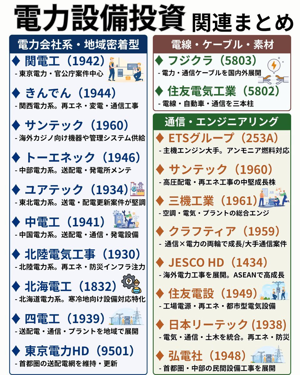 📘【電力インフラ関連が一斉高📈】 データセンター建設・半導体工場の増加で“電力網の再構築”が本格化。 ✅SWCC:+15.9%(好決算&通期上方修正) ✅トーエネック:+5.2% ✅関電工:+4.1% 送電・配電・電線・工事関連を整理👇 ⚙️① 送配電・電力会社(設備投資の中心) x.com/kenchanfan_com…