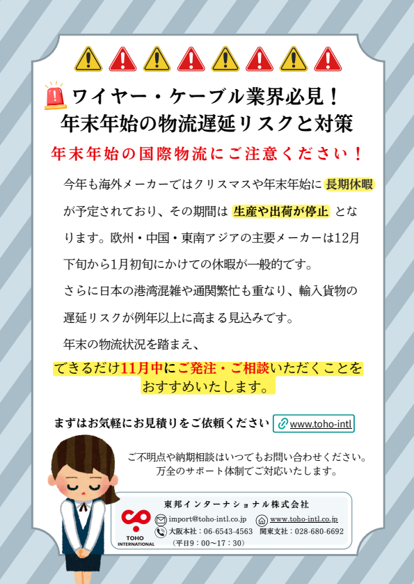 11月に入り寒くなってまいりました。クリスマス🎄の雰囲気もちらほら出てきましたね。本日は弊社のお客様向けのお知らせになります。 お問い合わせはHPでも受け付けております! toho-intl.co.jp #電線 #ものづくり #ケーブル #ワイヤー pic.x.com/qW6JAiFaLZ