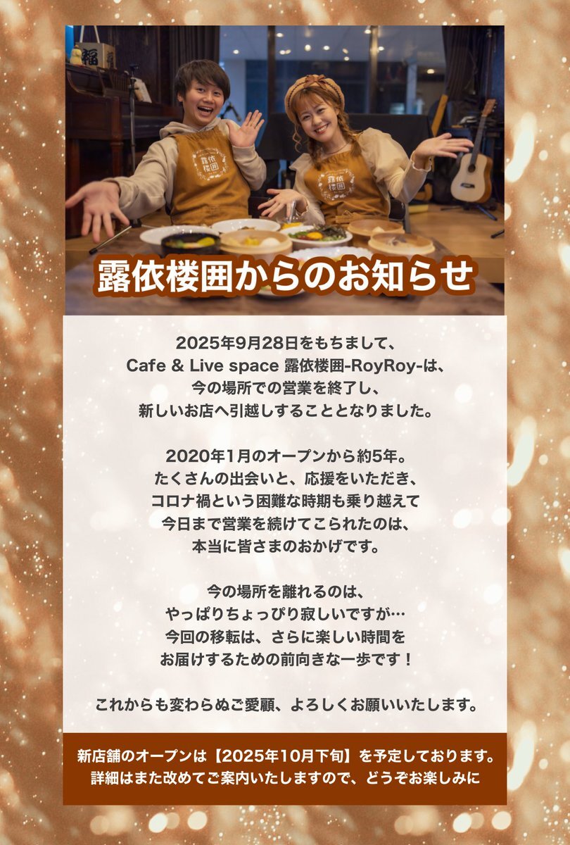 露依楼囲からのお知らせ📢 2025年9月28日をもちまして Cafe & Live space 露依楼囲は 今の場所での営業を終了し 新しいお店へお引越しします🏠 移転まで色々なイベント企画中❣️ 同時に新店舗の準備もしている為 バタバタしてしまってますが💦 随時お知らせさせて頂きます🙇♂️