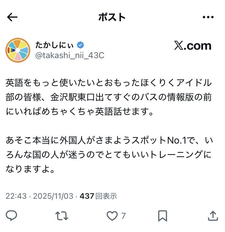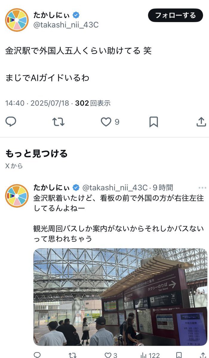 金沢駅で外国人五人くらい助けてる埼玉県在住50代独身爺! たかしにぃ参上! AIガイドがなくても我らがたかしにぃがいるから無問題! これから毎日金沢駅のパトロールをするとかしないとか☺️ 大した爺だねえ👍 #たかしにぃ #ほくりくアイドル部 #ラフラフ #ラフり隊 #外国の方が右往左往 x.com/foolafoolamob/…