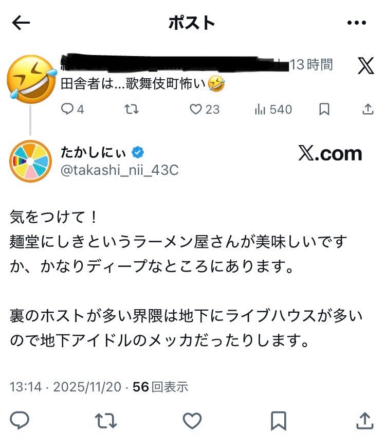 歌舞伎町怖い!って言ってる人にはJRか地下鉄か西武線かバスで新宿から移動してねって伝えるのがベストなんじゃないかな? 単に自分が気に入ってるラーメン屋の話をしたいだけで🍜相手の立場とか一切考えてないんだよね😌 #たかしにぃ #ほくりくアイドル部 #ラフラフ #ラフり隊 #青春高校3年C組 pic.x.com/D4x1FYypOF x.com/foolafoolamob/…