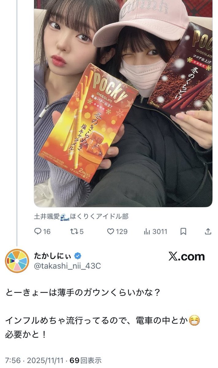 とーきょーは薄手のガウン? ガウン⁈ ガウン着て山手線とか丸の内線乗ってる人一度も見たことないよ とーきょーって埼玉県の地名かな😂 たかしにぃが住んでる埼玉県の電車だと、ガウン着て電車乗ってるのかな?☺️ #たかしにぃ #ほくりくアイドル部 #ラフラフ #ラフり隊 #青春高校3年C組 #詐称都民 x.com/foolafoolamob/…