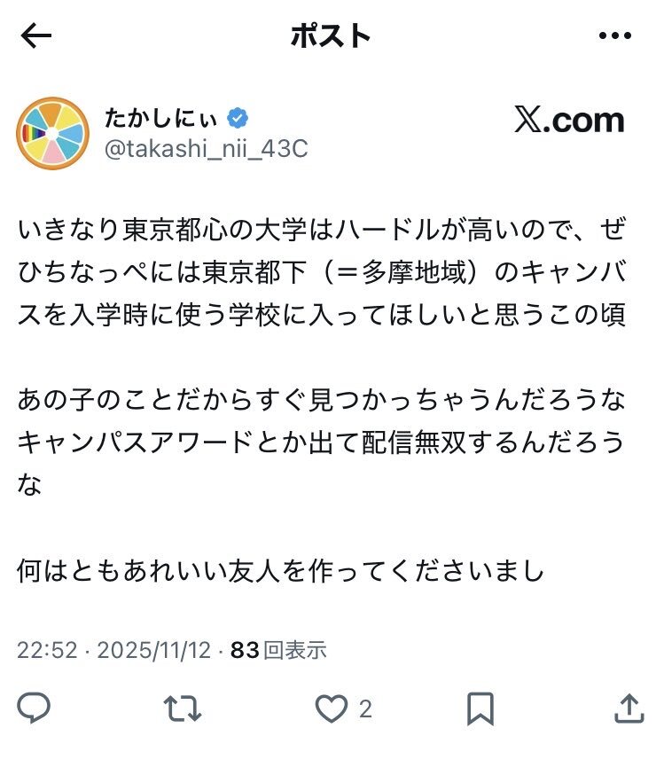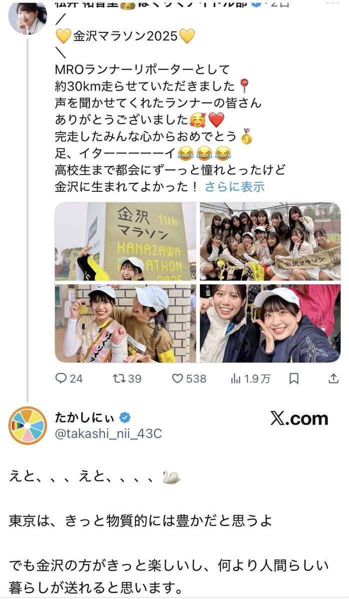 えと、、、、 たかしにぃは埼玉県民だから東京のこと分かってないけど、きっと物質的には豊かだと思ってて、 でも金沢の方がきっと楽しいし、何より人間らしい暮らしが送れると思ってる 上から目線でごめんねー笑 #たかしにぃ #ほくりくアイドル部 #ラフラフ #ラフり隊 #青春高校3年C組 #詐称都民 x.com/foolafoolamob/…