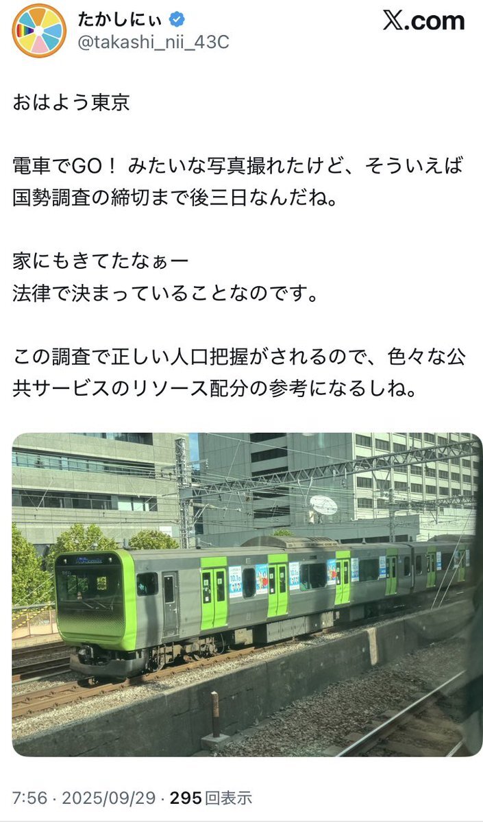 おはよう埼玉爺! 爺は国勢調査の締切があさって=10月1日っていってるけど、総務省は10月8日までって告知してるよ? 君の好きな地下アイドルのライブ情報みたいに適当に発信してデマ広めたら法律で罰せられるよ? #たかしにぃ #ほくりくアイドル部 #ラフラフ #ラフり隊 #青春高校3年C組 #詐称都民 pic.x.com/NdV5T3eZXU x.com/foolafoolamob/…