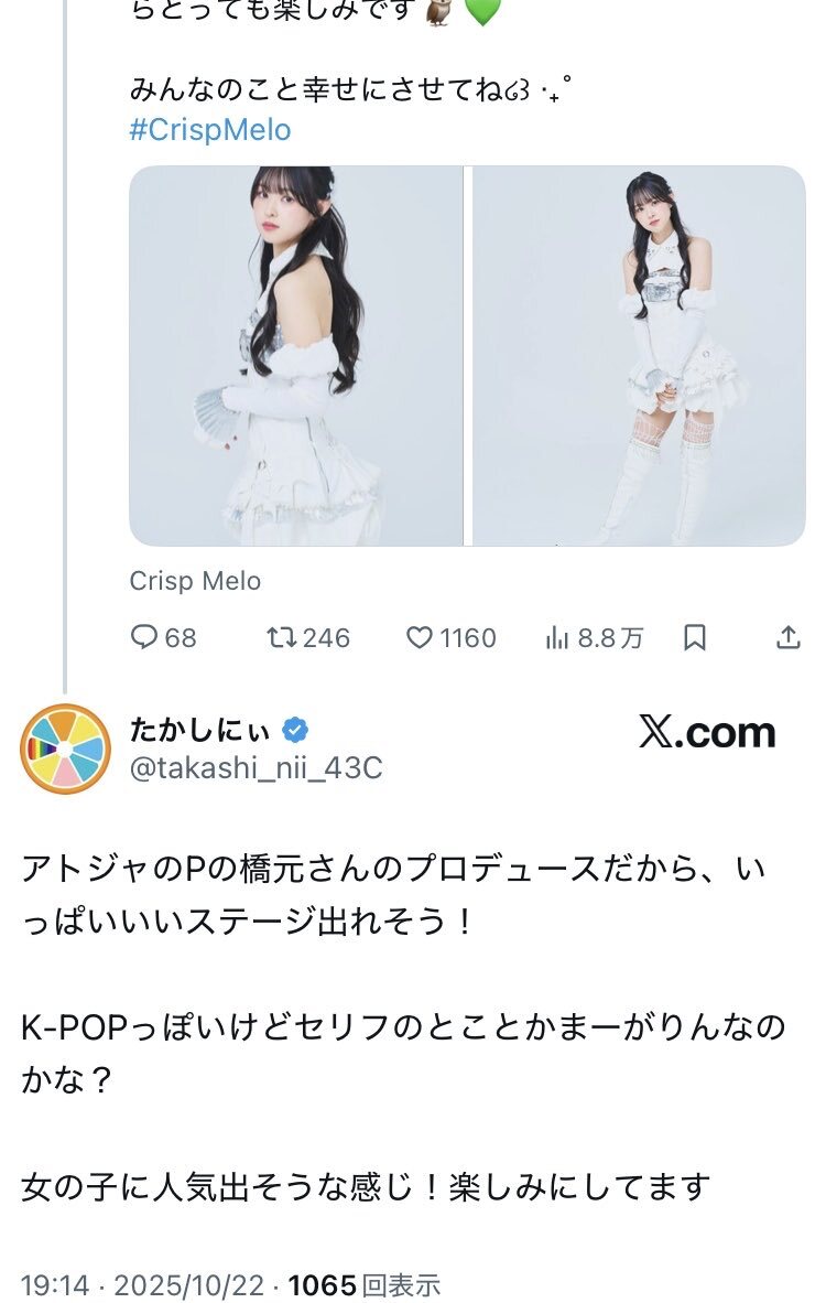 【ご報告】 この度、CrispMeloとして活動させていただくことになりました、大曲李佳です。 またこうしてアイドルとして活動できること、正直私が一番驚いています。 皆さんとこれからどんな景色が見られるのか、今からとっても楽しみです🦉💚 みんなのこと幸せにさせてね໒꒱ ‧₊˚ #CrispMelo