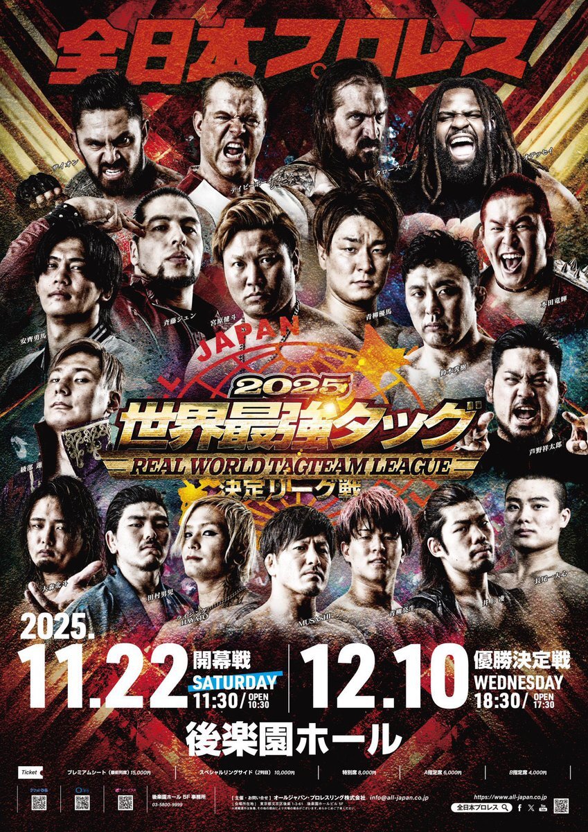おはようございます #ajpw #最強タッグ2025 開幕戦🎊まであと3️⃣日! いよいよ全日本プロレス暮れの風物詩 が始まる👍 勿論、青柳兄弟を応援📣するけど 両チームは別にエントリー 一人一人怪我なく12/10まで勝ち進んで頂きたい✌ #青柳優馬 #青柳亮生 pic.x.com/gTmBXUIYdw