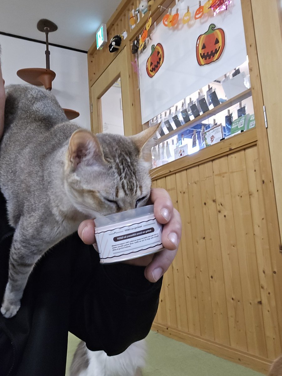 返信先:@cafeneko8楽しかったALL DAY🐈️🐱。 今日の撮れ高、おやつタイム時で約1年振りの肩乗りテトです🐟。 #青森県八戸市 #猫カフェ #猫八 #オヤツタイム #シンガプーラ #肩乗りテト pic.x.com/IusIzgdZKr