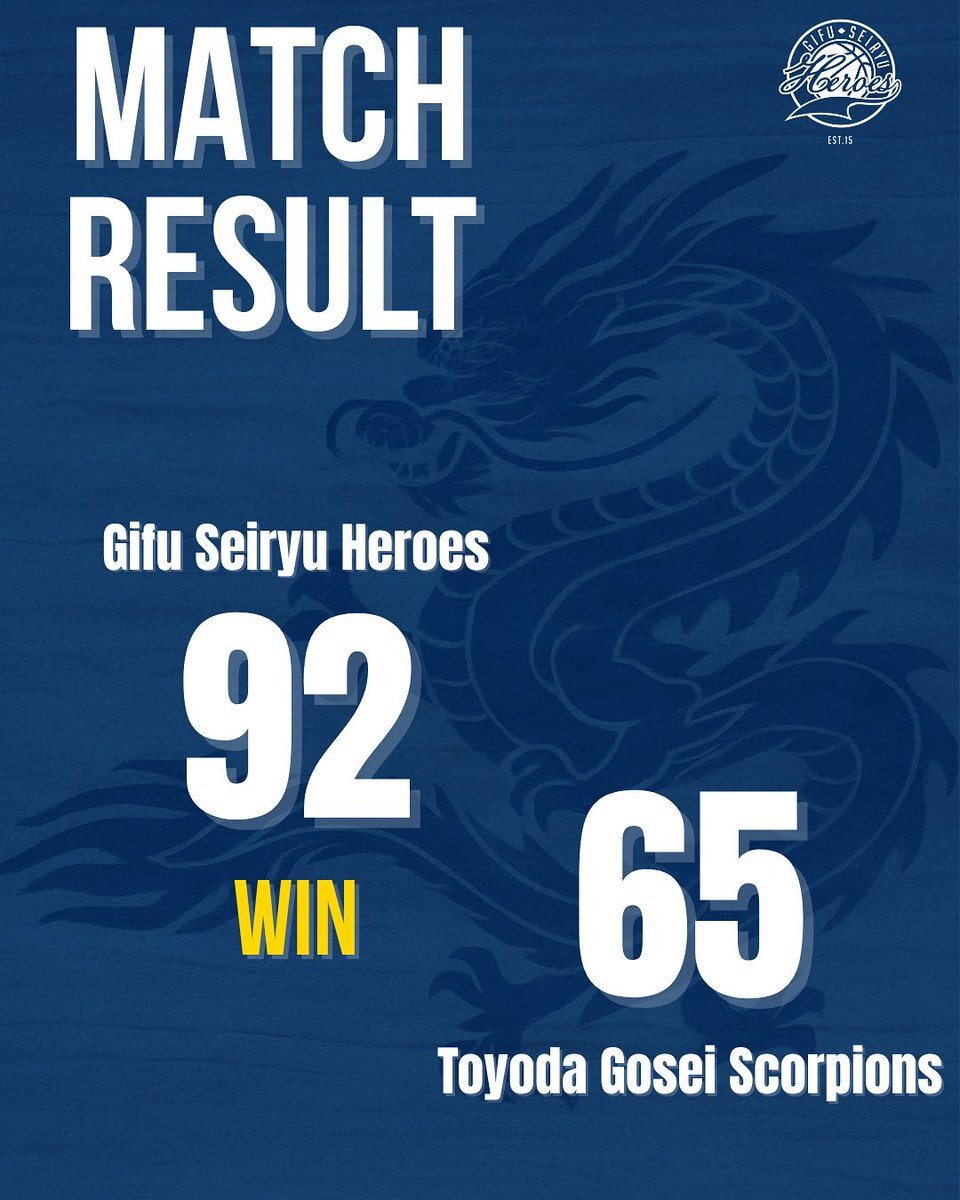 【試合結果】 東海・北信越SB2リーグ 🆚豊田合成スコーピオンズ 92-65 Win 序盤から速い展開でリードし全員出場で勝利🔥 2日間応援ありがとうございました🥺📣 #GifuSeiryuHeroes #岐阜セイリュウヒーローズ #青龍 #岐阜 #多治見 #バスケ #地域のヒーローに pic.x.com/Pyc7nd46fo