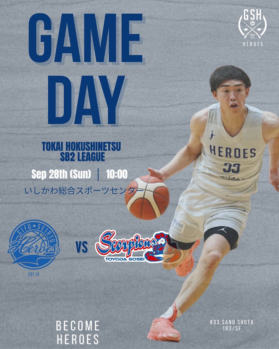 🔥Game Day🔥 東海・北信越SB2リーグ 🗓️9/28(日) 📍いしかわ総合スポーツセンター(石川県金沢市) 🕓10:00 🆚豊田合成スコーピオンズ #GifuSeiryuHeroes #岐阜セイリュウヒーローズ #青龍 #岐阜 #多治見 #バスケ #地域のヒーローに pic.x.com/VEMWCa1OCO