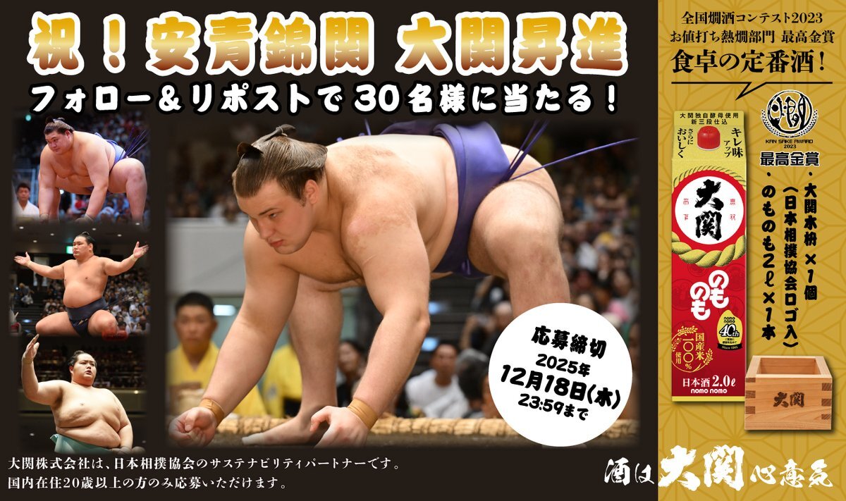 \㊗安青錦関 大関昇進おめでとう!/ "大関"昇進記念に"ますます"のご活躍を祝って 「のものも2L+大関木桝」を【30名様】にプレゼント🎁 ▼応募方法 ①@ozeki_jpをフォロー ②本投稿を12/18(木)までにリツイート #のものも飲んで大相撲応援+応援コメント付きの 引用リポストで当選確率UP✨