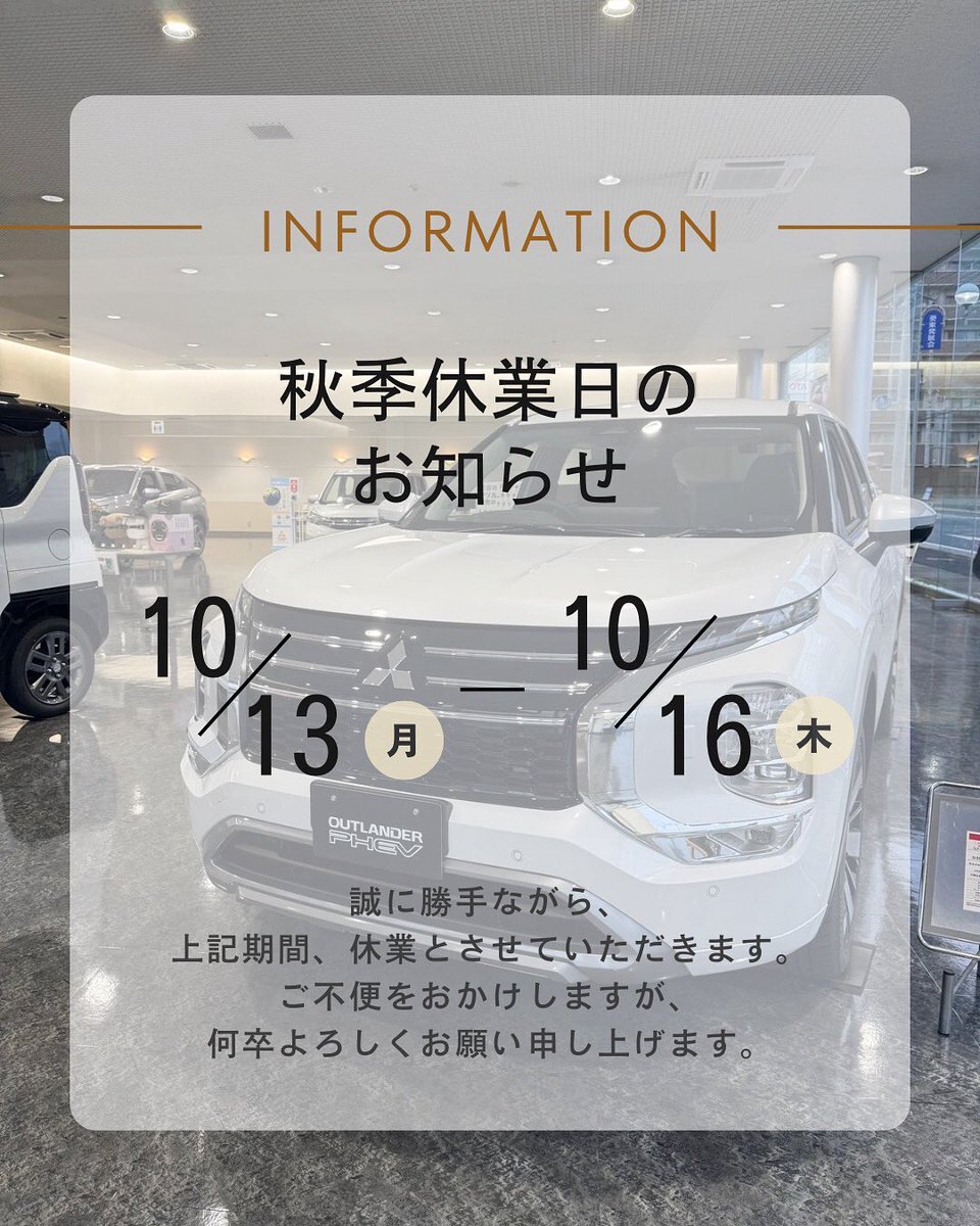 🍂秋季休業のお知らせ🍂 誠に勝手ながら、10/13(月)〜10/16(木)の期間お休みをいただきます。 お車のトラブルの際は、JAF【#8139】または0570-00-8139へ🚗ご不便をおかけしますが、何卒よろしくお願いいたします🙇‍♀️ #静岡三菱 #三菱 #浜松市 #アウトランダーPHEV pic.x.com/UGX3PHEnM1