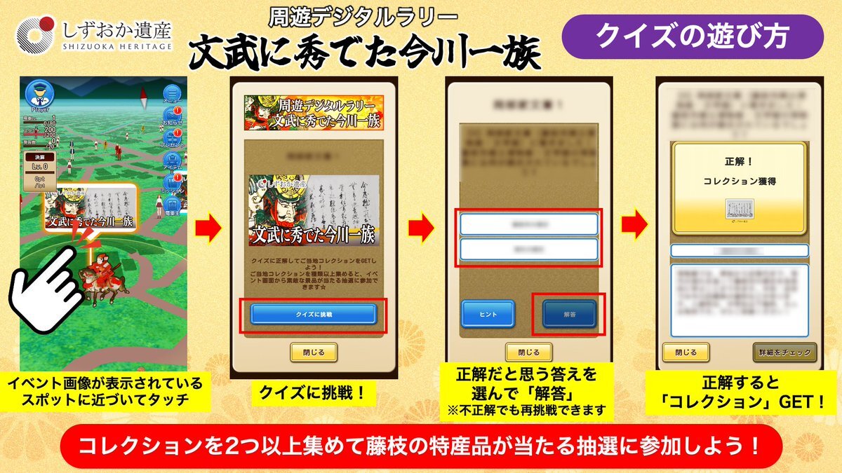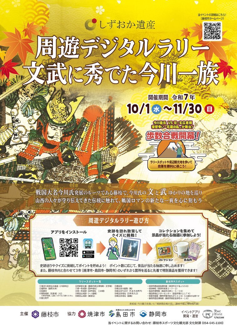 #トレトレ de楽しむ #しずおか遺産 🏯 「文武に秀でた今川一族」周遊デジタルラリー⚔️ 今川一族ゆかりの史跡でクイズに挑戦しよう📝 2問以上正解すると #藤枝 の特産品が当たる抽選に参加できます 🎯 🆓参加費:無料🆓 詳細はコチラ(#藤枝市 ホームページ) city.fujieda.shizuoka.jp/kyodomuse/1/3/… #朝比奈大龍勢 x.com/TRAIN_CEO/stat…
