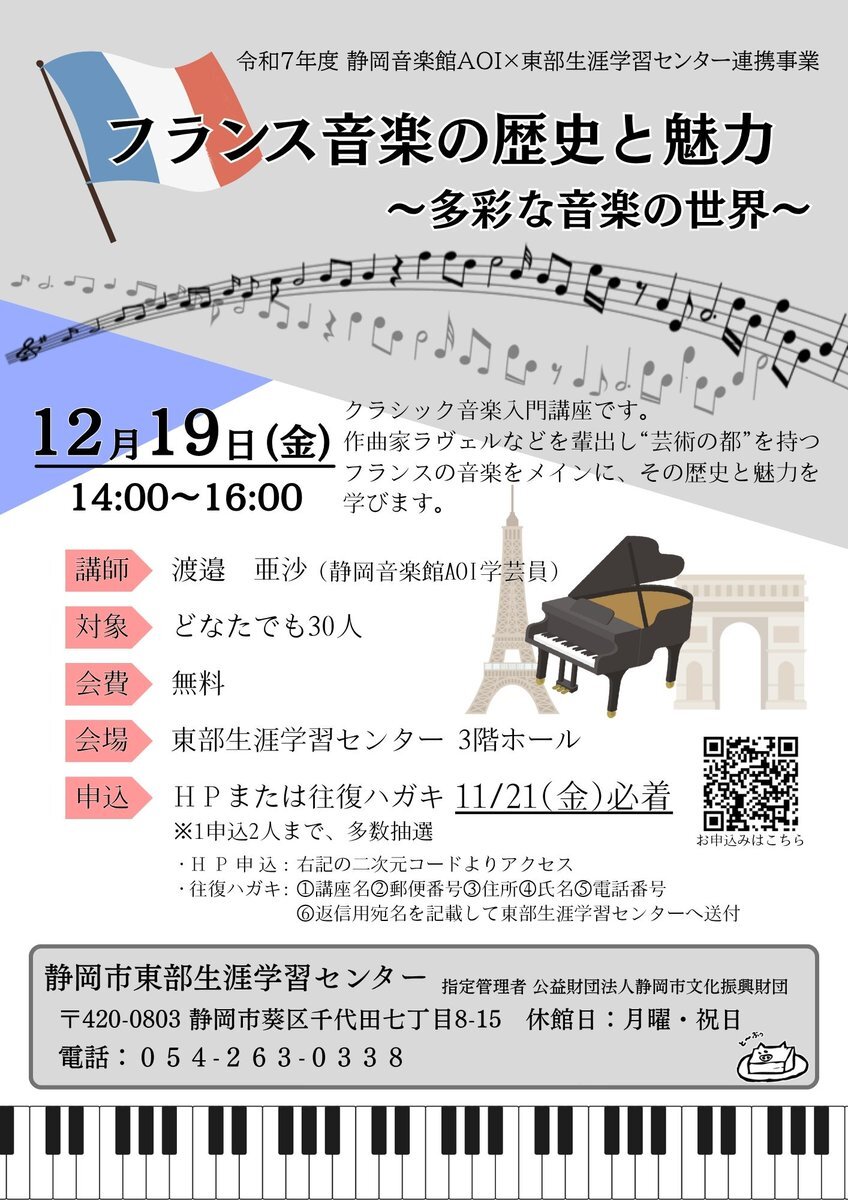【11/21締切@東部】 「フランス音楽の歴史と魅力 ~多彩な音楽の世界~」12/19(金)、14:00~16:00 クラシック初心者向けの講演会です。作曲家モーリス・ラヴェルを中心にフランス音楽について学びます。 会費無料 #静岡市 #生涯学習 sgc.shizuokacity.jp/event/detail.p… pic.x.com/a3AvuZNFu3