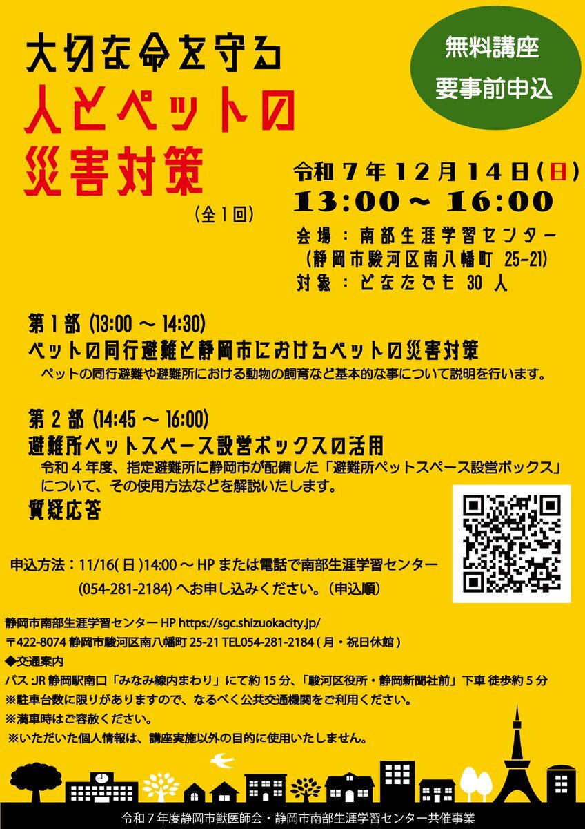 【11/16~受付@南部】 「大切な命を守る人とペットの災害対策」12/14(日)、13:00~16:00 ペットと暮らす上で飼い主として必要な災害の備えや災害対策について学びます。 会費無料 #静岡市 #生涯学習 sgc.shizuokacity.jp/event/detail.p… pic.x.com/QMCiQMBT3Z