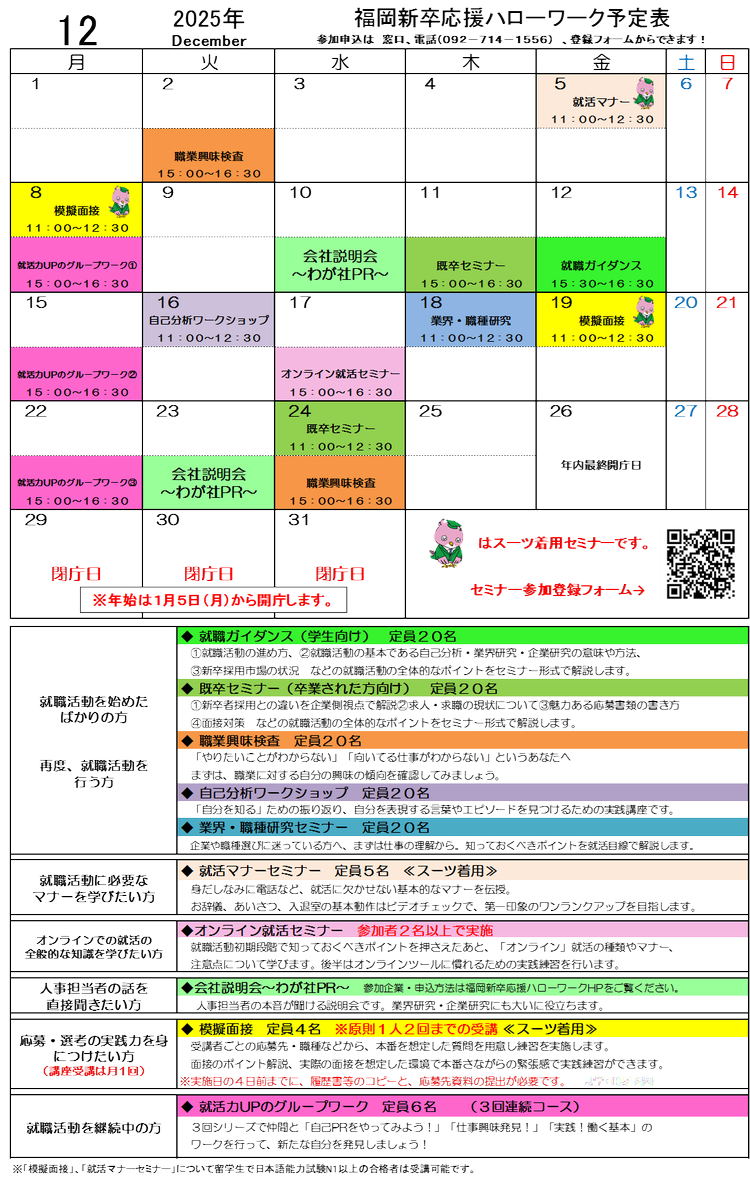 \12月開催セミナーのご案内/ 福岡新卒応援ハローワークでは就活に役立つセミナーを開催しています。 ☑就職ガイダンス(#27卒 向け) ☑職業興味検査 ☑模擬面接 など 全セミナー参加無料・事前予約制です。 参加申込はこちらから👇 jsite.mhlw.go.jp/form/pub/roudo… #就活 #セミナー #面接 pic.x.com/FM5jHVIgfW