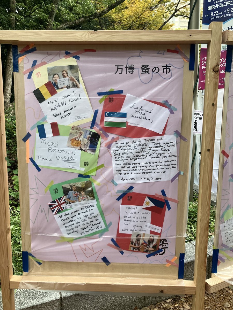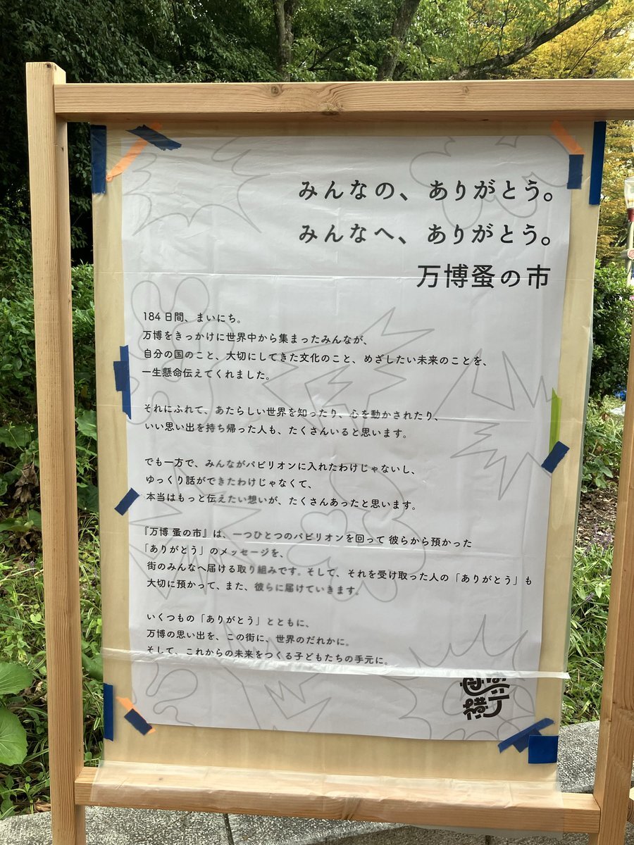 蚤の市は当たりませんでしたけれど、蚤の市のテント前にあったメッセージを見ることができたのでお裾分け。 タップして拡大して見てみてくださいな。 #世界横丁 #靱公園 #万博ロス pic.x.com/QvmK0P8lOb