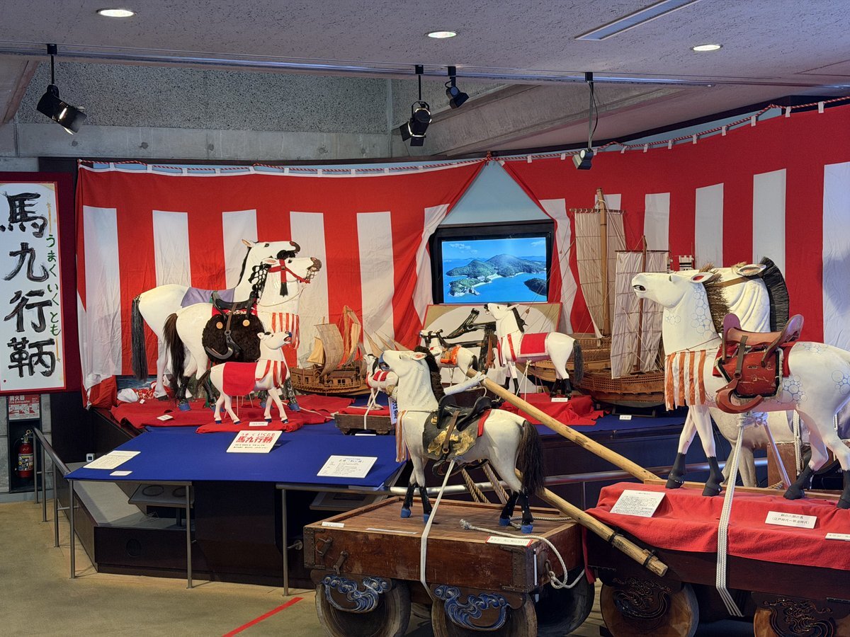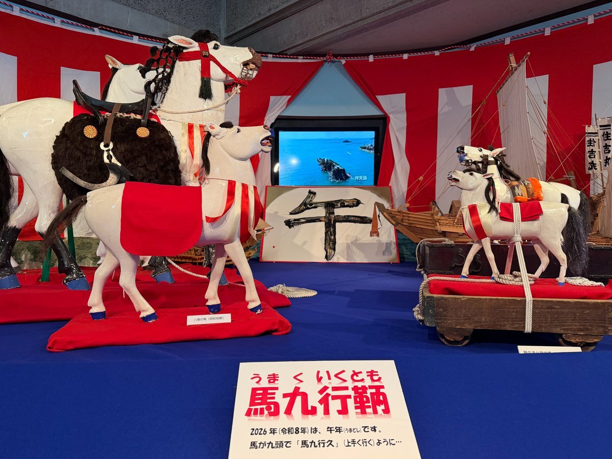 2026年は午(うま)年。1Fロビーには鞆ならではの馬「八朔の馬」が九頭展示しています。馬が九頭で上手く行く。上手く行くよう願いを込めての展示です。 また、松竹梅が入った「保命酒徳利」も並んでいます。#午年 #八朔の馬 #馬九行鞆(うまくいくとも) #鞆の浦 #鞆の浦歴史民俗資料館 pic.x.com/CbAjWlFfFF