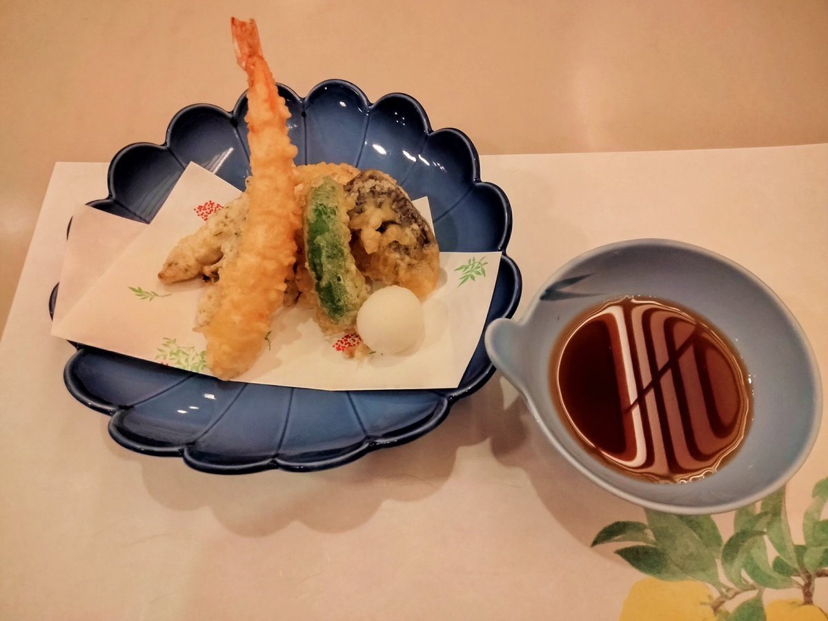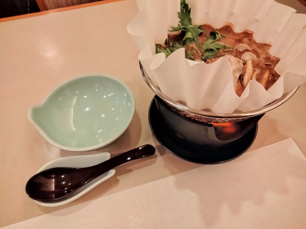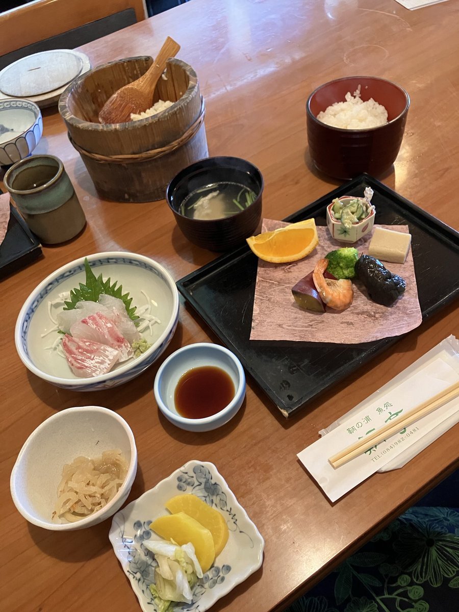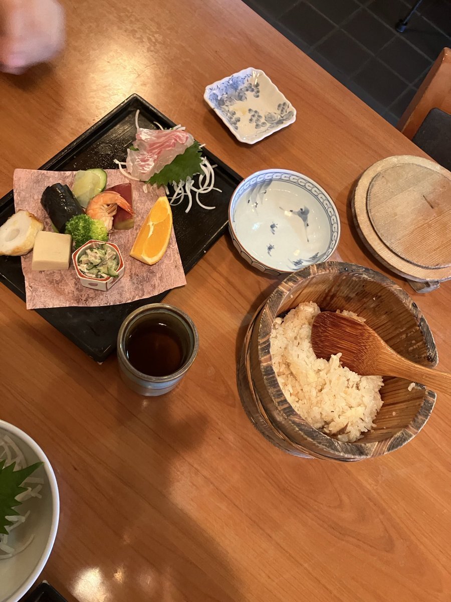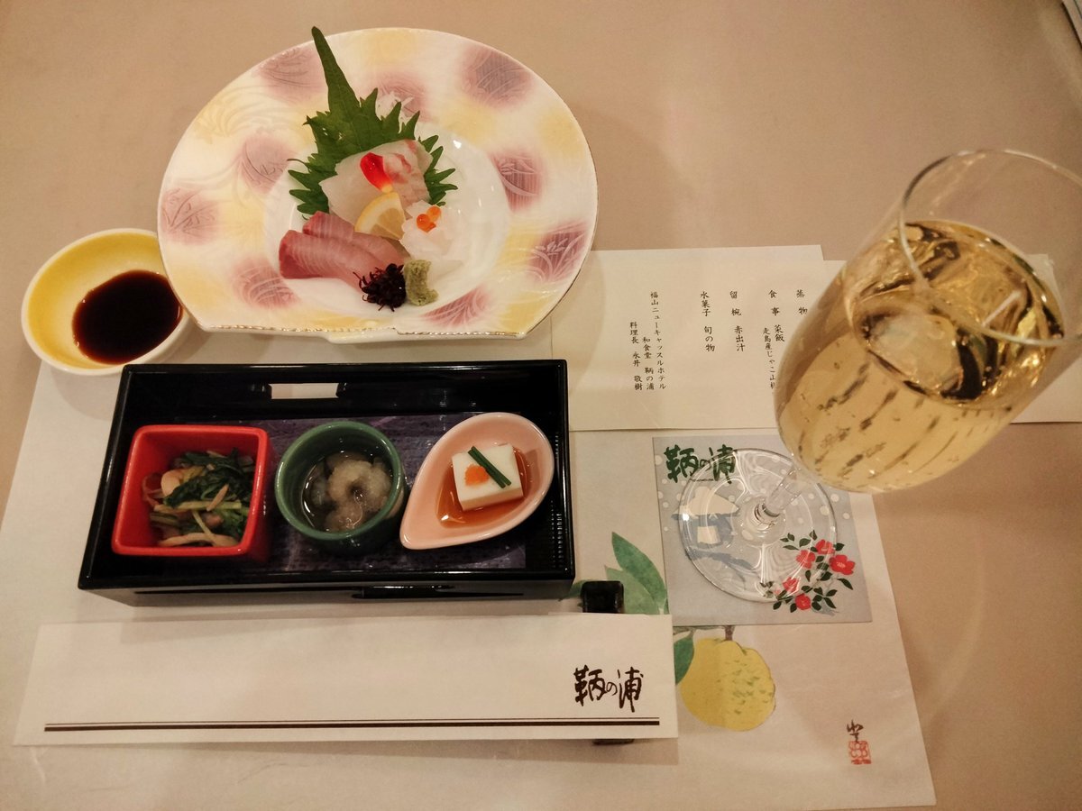 #福山 🌹に戻ってきました🌃今回は先々週以来の『#福山ニューキャッスルホテル 🏨』の地下1階にある『和食堂 #鞆の浦』で夕食🥢"ミニ会席「瀬戸内」"をオーダー☺「造里」は #鯛 ・鮪・間八🐟️・烏賊椿🦑、「温物」は #牡蠣味噌󠄀鍋 🦪🍲、「揚物」は"海老🦐と公魚の風味揚げ"✨️どれも美味しい😋
