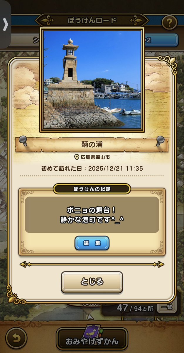 #DQウォークおみやげシーズン2 自力47/94ヶ所目 鞆の浦(広島県) ポニョの舞台ですね! 港の所々にポニョの足跡があるそうです^_^ 船着場では周りの島々を周遊できるフェリーが通ってます🚤 #広島県 #鞆の浦 #ドラクエウォーク pic.x.com/9z58ARpObP