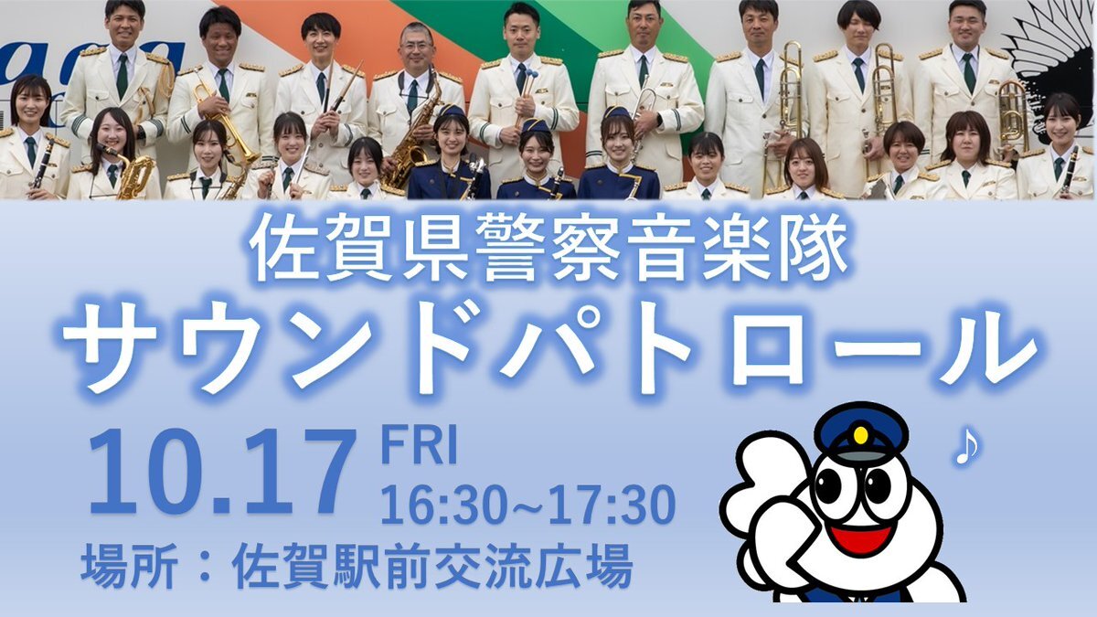 【警察音楽隊】 警察音楽隊演奏会~サウンドパトロール~を開催します🎵 📌日時:10月17日(金)16時30分~ 📌場所:佐賀駅前交流広場 佐賀商業高校吹奏楽部の皆さんに賛助出演していただきます🙌 高校生と音楽隊との共演をぜひお楽しみください✨ ※雨天時は中止の可能性がありますので、ご了承ください。