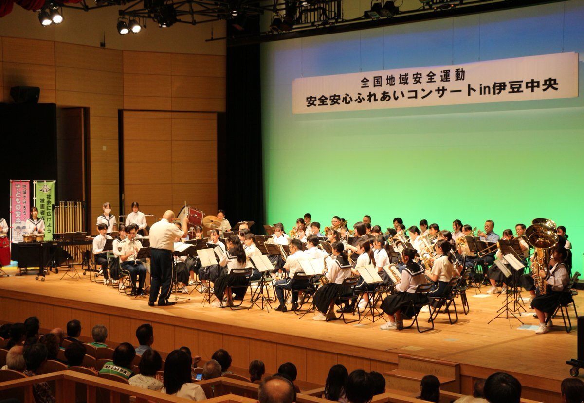 #全国地域安全運動】 伊豆の国市で開催された「安全安心ふれあいコンサートin伊豆中央」に #音楽隊 が参加🎷 伊豆中央署員、韮山中学校吹奏楽部との合同演奏や隊員による防犯寸劇を披露。満員の会場は、終始、笑顔と拍手に包まれていました。また伊豆でお会いしましょう! pic.x.com/7ZY6Qw7971