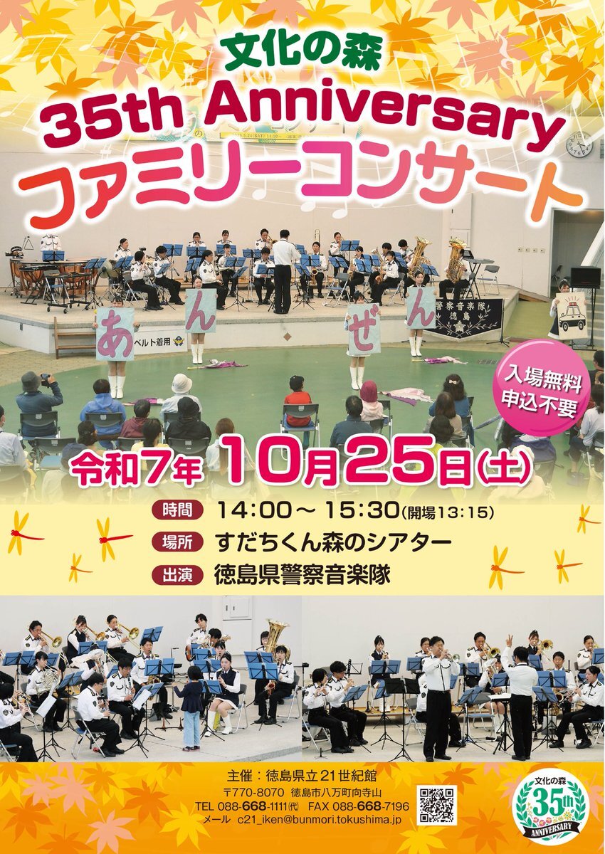 #徳島県警察音楽隊】 🎷文化の森35th Anniversaryファミリーコンサートの開催🎷 令和7年10月25日(土)  14:00~15:30(開場13:15) 徳島県立21世紀館 すだちくん森のシアター 入場無料・申込不要 子供から大人まで楽しめる曲を演奏しますので、皆さん楽しみにご来場ください #音楽隊 #文化の森 pic.x.com/hUCv6OsLtA
