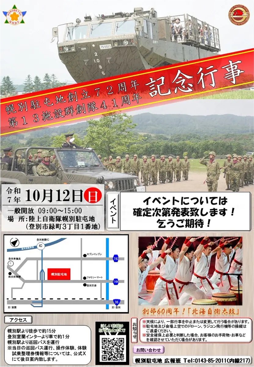 令和7年10月12日(日) 「#幌別駐屯地 創立72周年・第13施設群創隊41周年 #記念行事」に #北部方面音楽隊 が参加します! たくさんのご来場お待ちしております♪ 詳細→ mod.go.jp/gsdf/jieikanbo… #自衛隊 #陸上自衛隊 #駐屯地 #音楽隊 #創立記念 #幌別 #吹奏楽 pic.x.com/XQAgqHZxAO