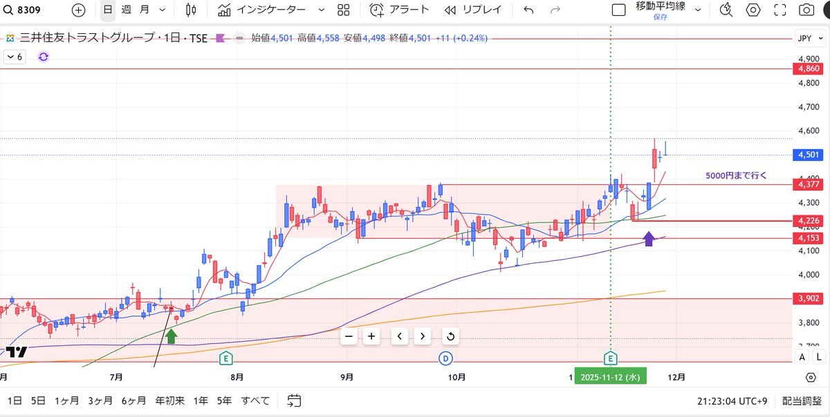 ◆8309 三井住友トラストグループ 3ヶ月の日柄を待って3日前にエントリー。 月・週・日足でパーフェクトオーダーの美しいチャートなのですが、大きな陰線の後コマコマと怪しい動き。SBIでポキッと折れて損切を喰らっているので逆指値入れておきます。 #順張り pic.x.com/szfXwBBju6